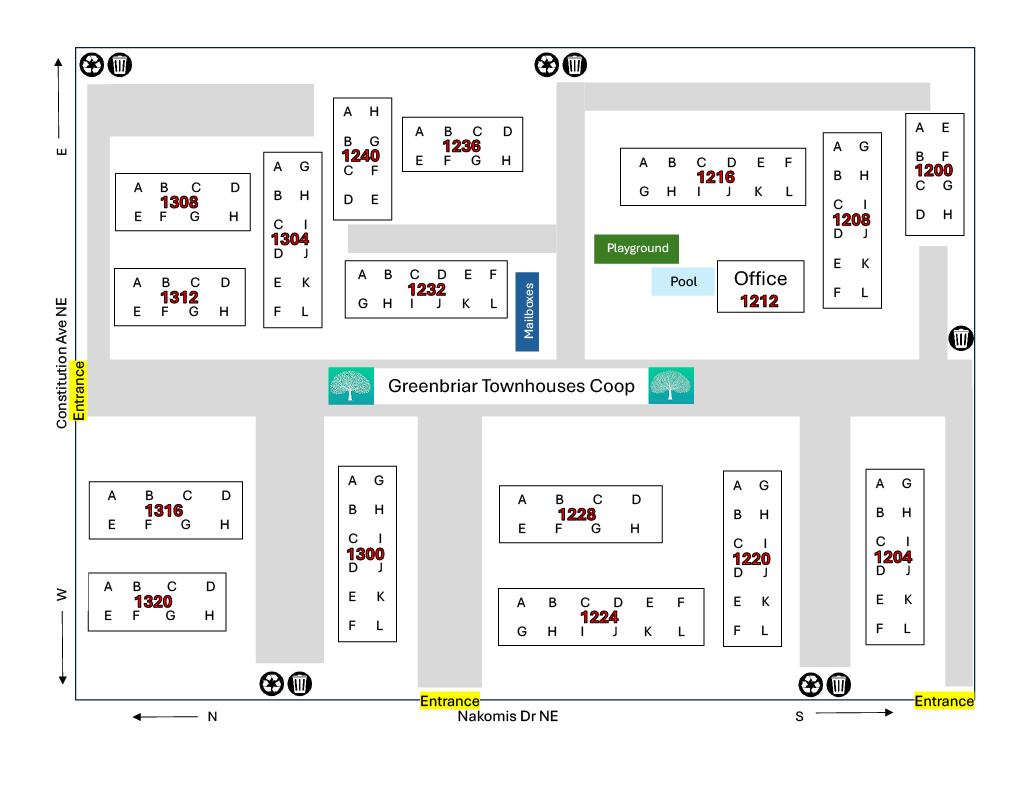 Greenbriar Townhouses Co-op is a development of 16 two-story residential buildings and a one-story office/community building on 10 landscaped acres with interior paved streets, resident parking, a small playground and pool. Each building has either 8 or 12 units, each with a private patio and one assigned parking spot. There is guest parking.